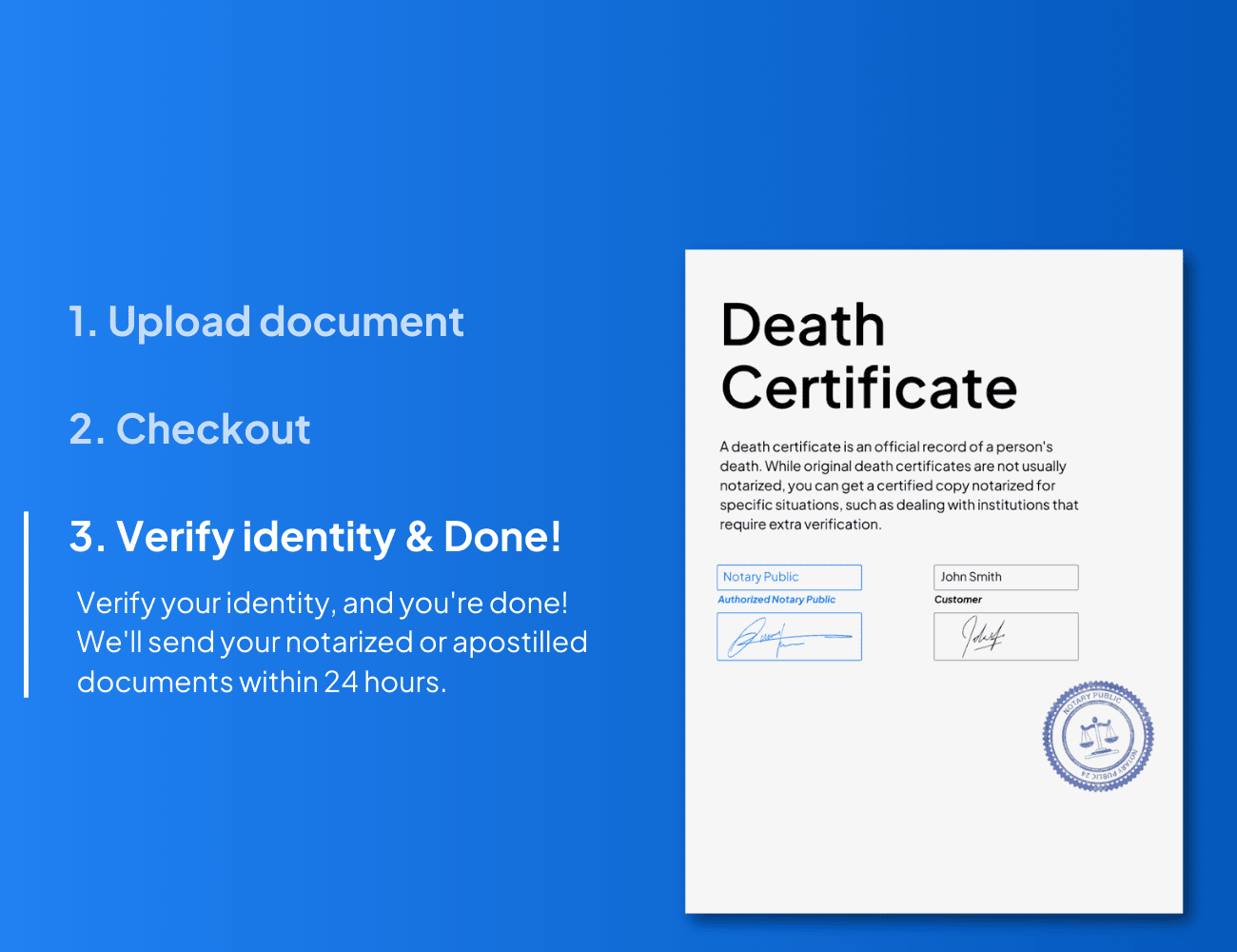 NotaryPublic24 ofrece un cómodo servicio de notarización en línea. Solo tiene que subir sus documentos, completar el proceso de compra y verificar su identidad en línea. Recibirá su certificado de defunción notarizado en 24 horas. Esto le ahorra el tiempo y las molestias de buscar un notario local, haciendo que el proceso sea rápido y eficaz.